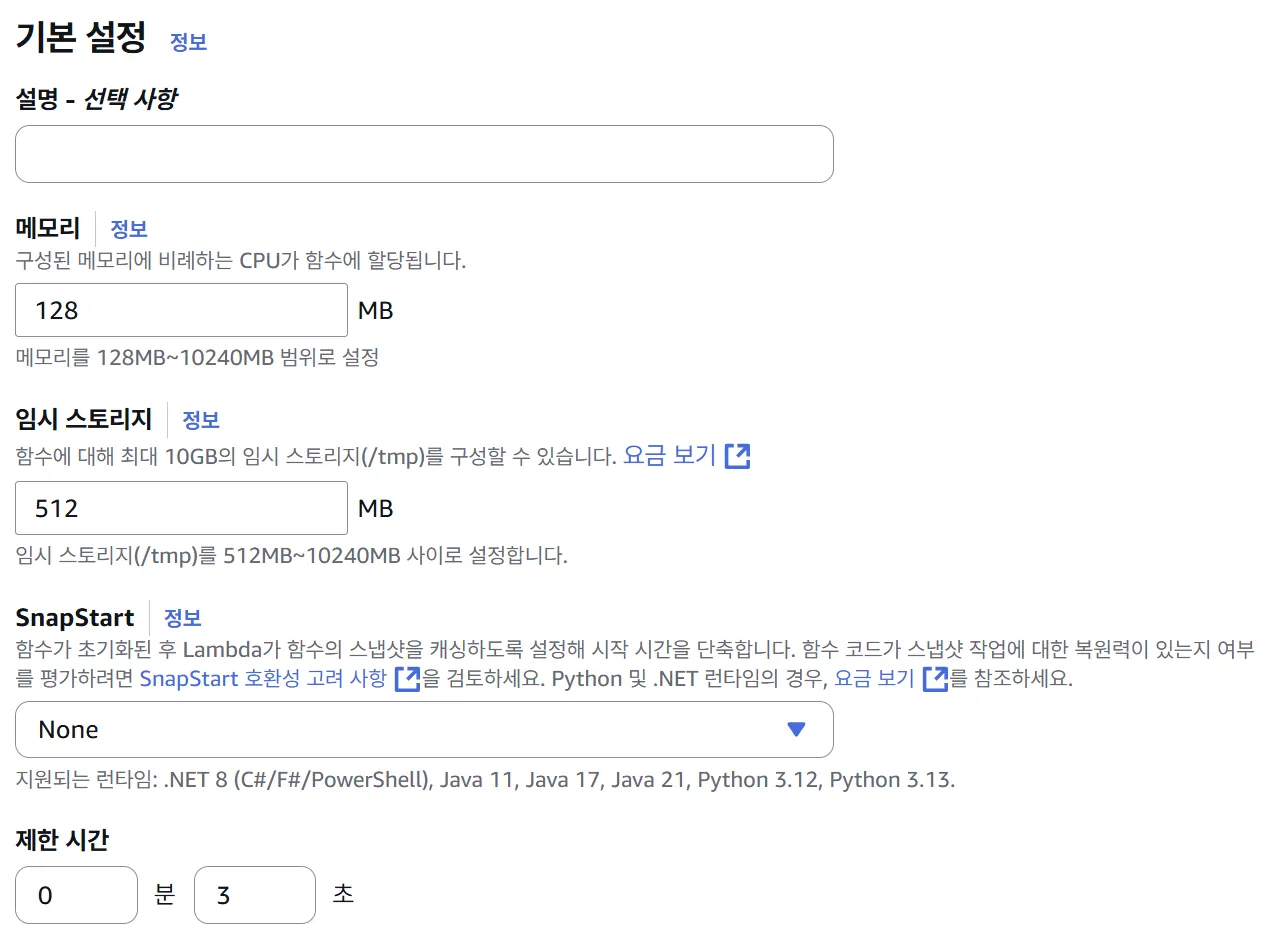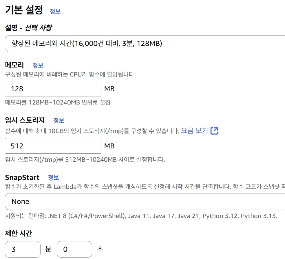 먼저, AWS Lambda 서비스의 기본 제한시간과 기본 메모리 크기를 늘렸습니다. 기본 제한시간인 3초동안 크롤링한 약 200개의 문제를 크롤링하여 최대 크롤링 제한 개수가 10,000건을 넘지 않는다는 가정하에 180초로 늘렸습니다.
