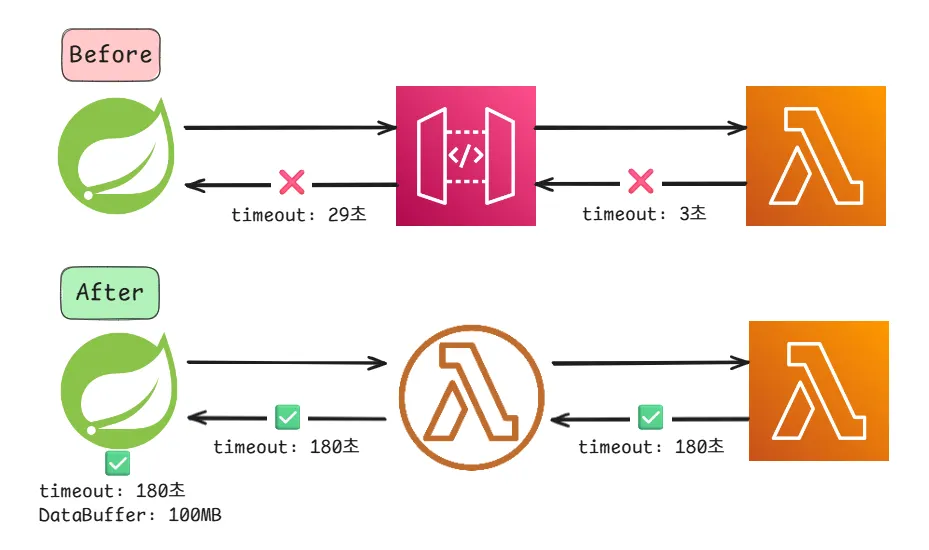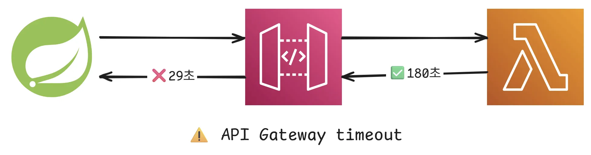 AWS API Gateway는 일반적인 웹 API 응답 시간을 고려해 최대 타임아웃을 29초로 제한하고 있습니다. 이는 웹 브라우저나 클라이언트가 너무 오래 기다리지 않도록 하는 안전장치 역할을 합니다.