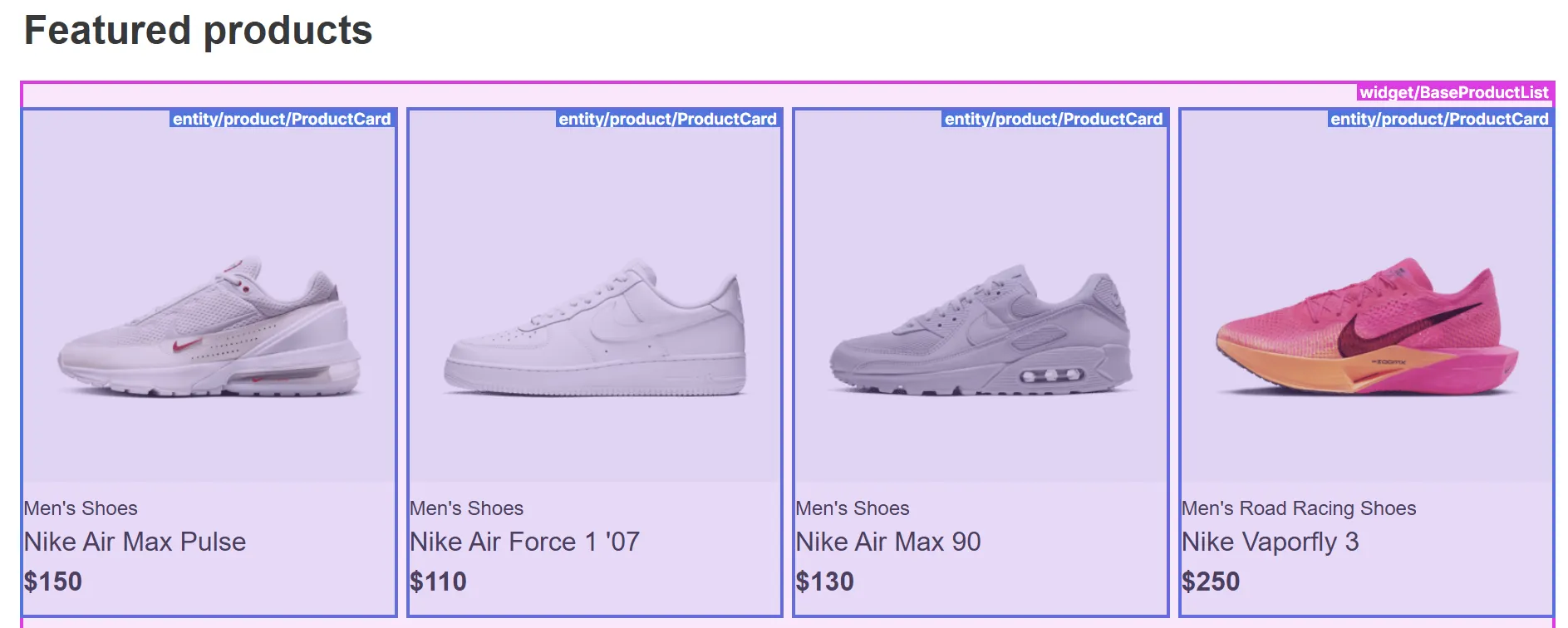 또 다른 예시로 예제. Nike Sneaker and Footwear Store 가 있다. 신발 목록들이 나오는 부분에서 각 신발 하나에 대해서는 데이터로 취급하여 Entity로 다루었고, 신발 여러개를 묶은 단위는 widget이 되었다.