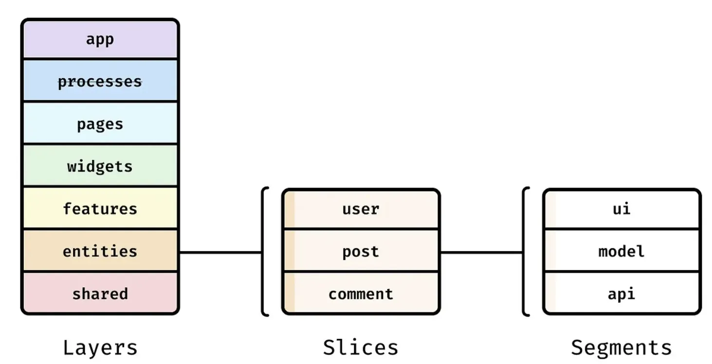 폴더 구조에 대한 아키텍쳐 중 FSD(Feature Slice Design) 아키텍처가 있다. 이 아키텍처에서는 폴더를 레이어, 슬라이스, 세그먼트의 3가지 개념으로 구성한다.