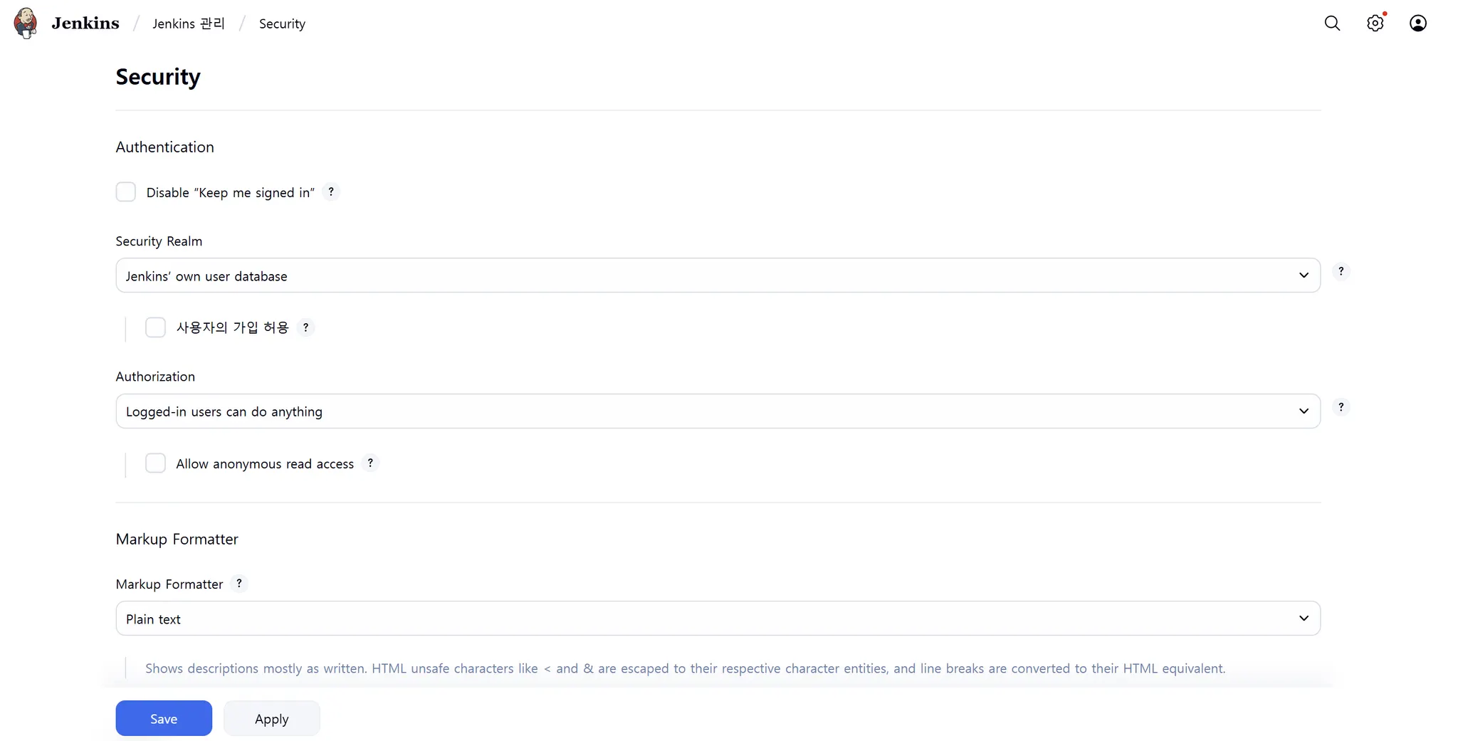 젠킨스 웹에 접속한 후 우측 톱니바퀴>security 를 눌러 젠킨스 보안 관리 페이지로 들어옵니다. 아래 설정을 진행합니다. 임의로 계정생성이 불가해지며 항상 접속 시 로그인을 하도록 합니다.
