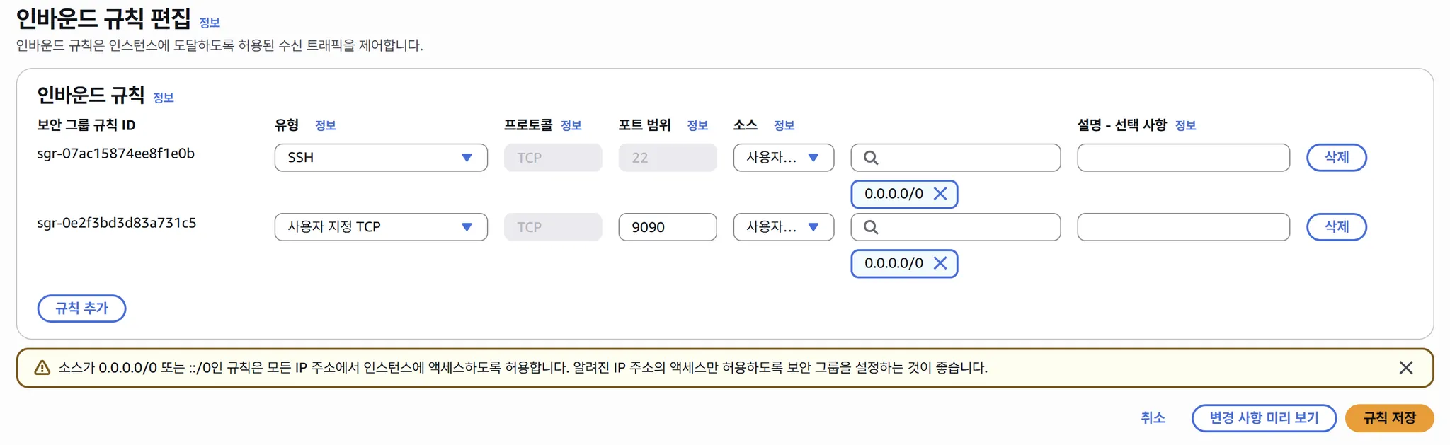 ec2의 젠킨스 웹으로 접속하기 앞서 9090포트를 인바운드 규칙에서 오픈해줘야 접속이 가능합니다.