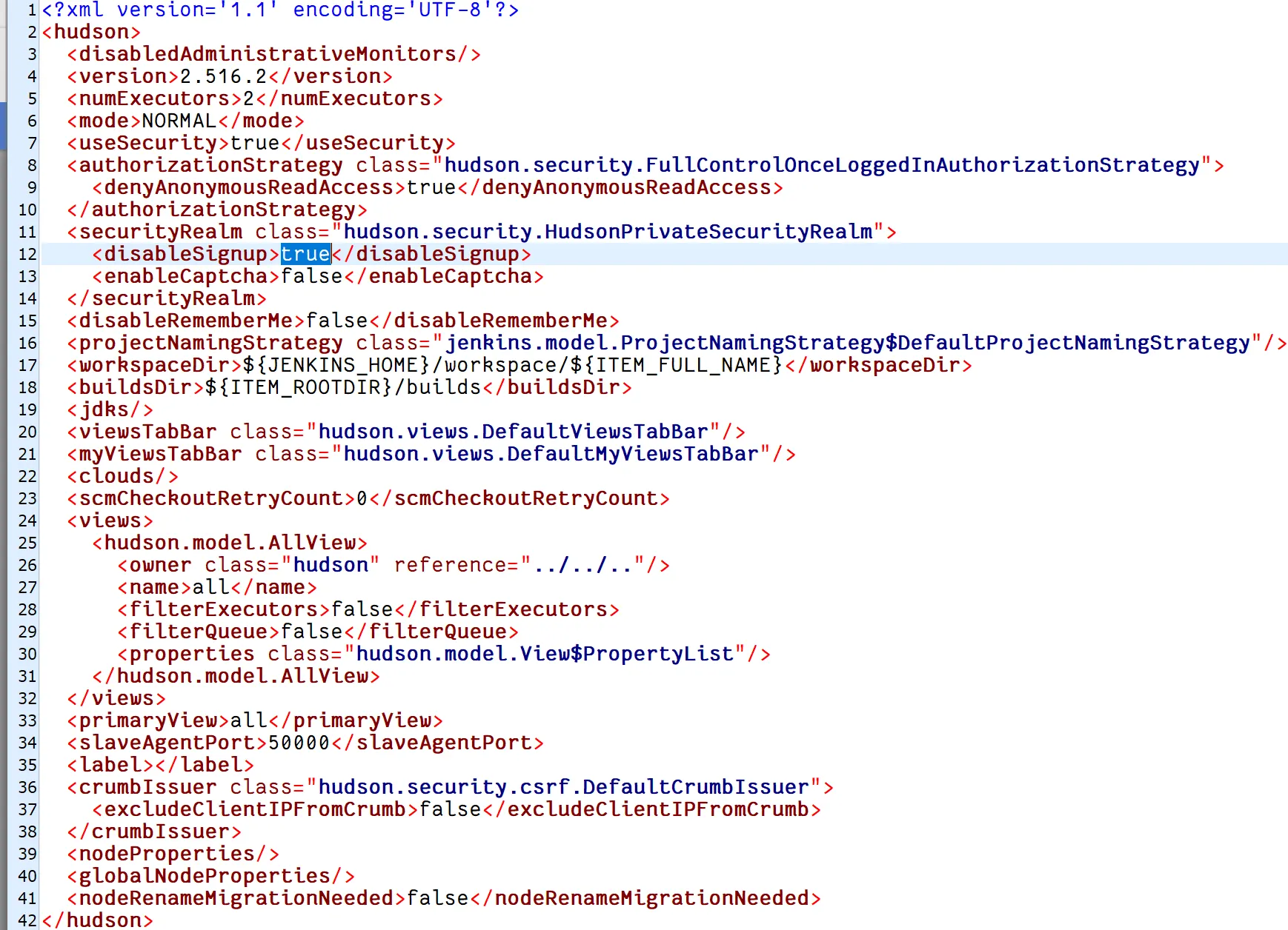 /home/ubuntu/jenkins-datat/config.xml 파일에 직접 회원가입하는 부분을 비활성화 합니다.(disableSignup 을 true 로 하여 직접 회원가입 비활성화)
