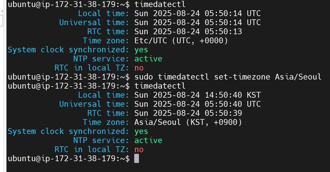 $ sudo timedatectl set-timezone Asia/Seoul # 서울로 설정