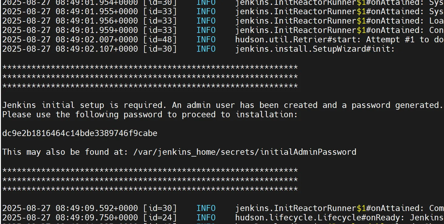 젠킨스를 도커로 실행시킨다. 그 다음 젠킨스 로그를 확인하여 임시 비밀번호를 확인한다.