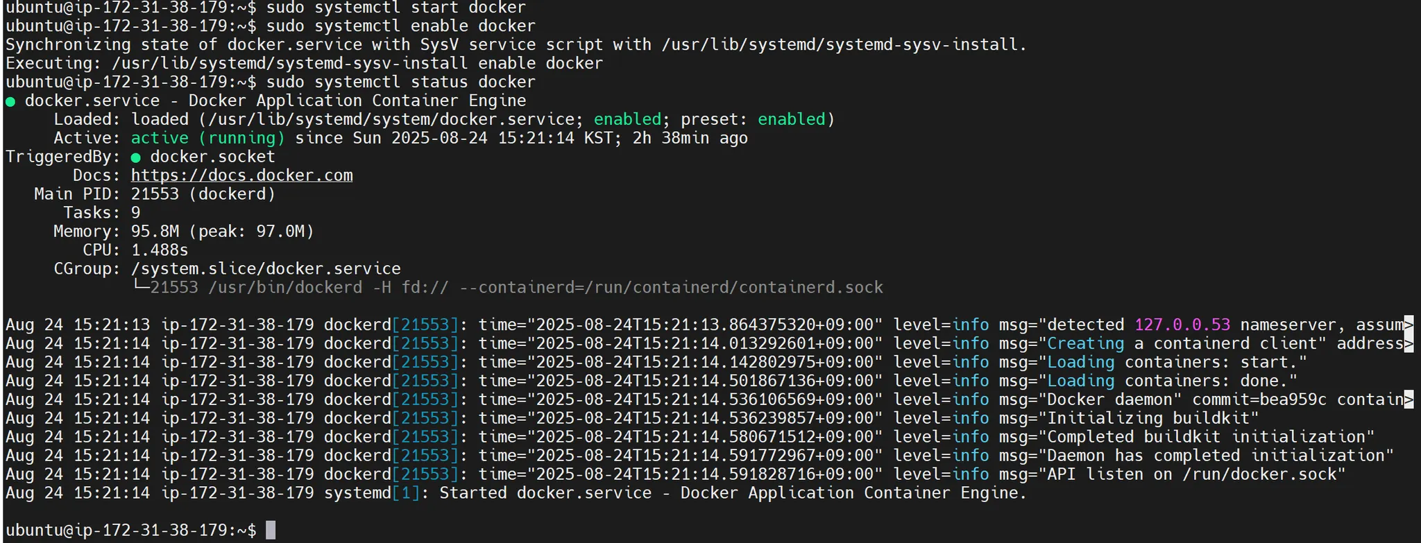 $ sudo systemctl enable docker # 서버 부팅 시 Docker가 자동으로 실행되어 컨테이너가 자동으로 구동되도록 설정