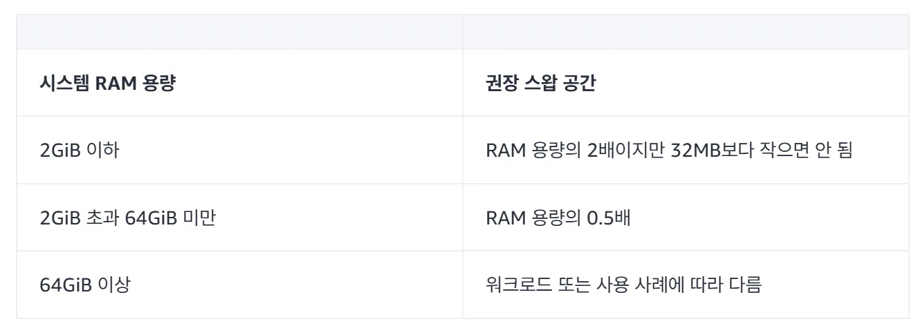 스왑 메모리는 실제 물리 메모리(RAM)가 부족할 때, 하드 디스크(SSD 등)의 일부 공간을 RAM처럼 사용하는 가상 메모리