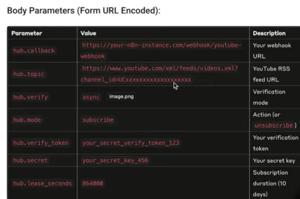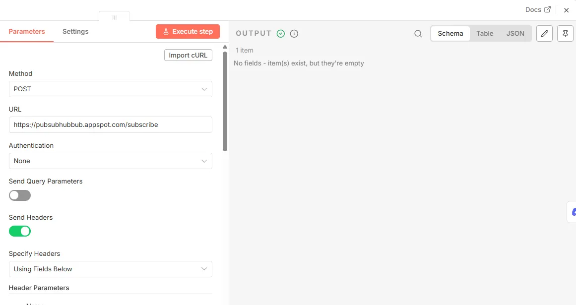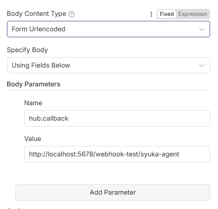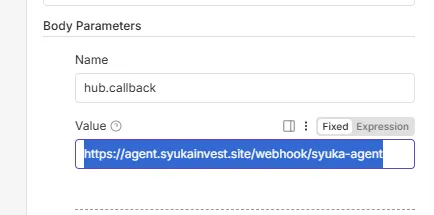 다시 트리거가 되는 웹훅으로 들어와 URL을 복사한 뒤, HTTP 요청 노드에 body 파라미터 hub.callback 부분에 값으로 넣어줍니다.