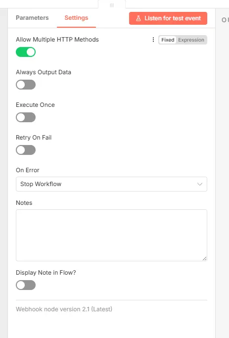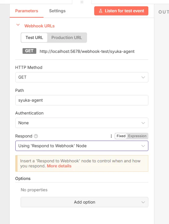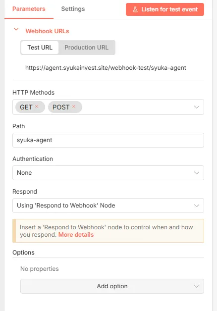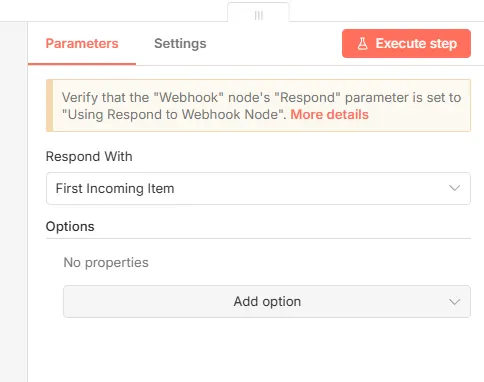 Response Webhook 노드를 연결해주고 기본값으로 놔둡니다.