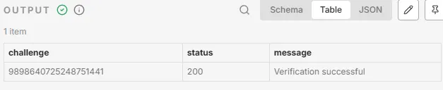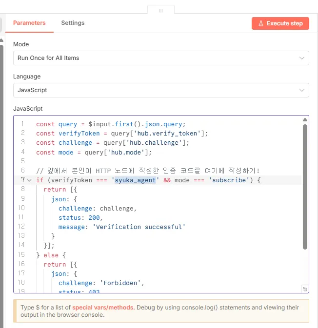 코드를 작성하고 실행시켜본다. 여기서 verifyToken부분은 이전에 HTTP 노드에서 작성했던 토큰을 똑같이 적어줘야한다.