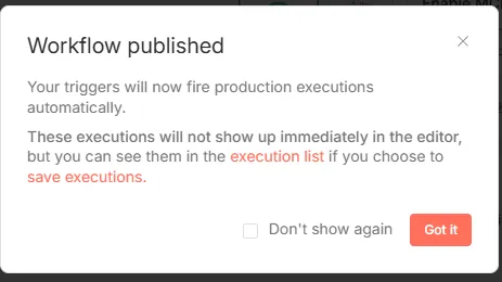 우상단에 publish버튼을 눌러 워크플로우를 배포하준다. 이제 배포된 워크플로우는 자동으로 작동할 것이다.