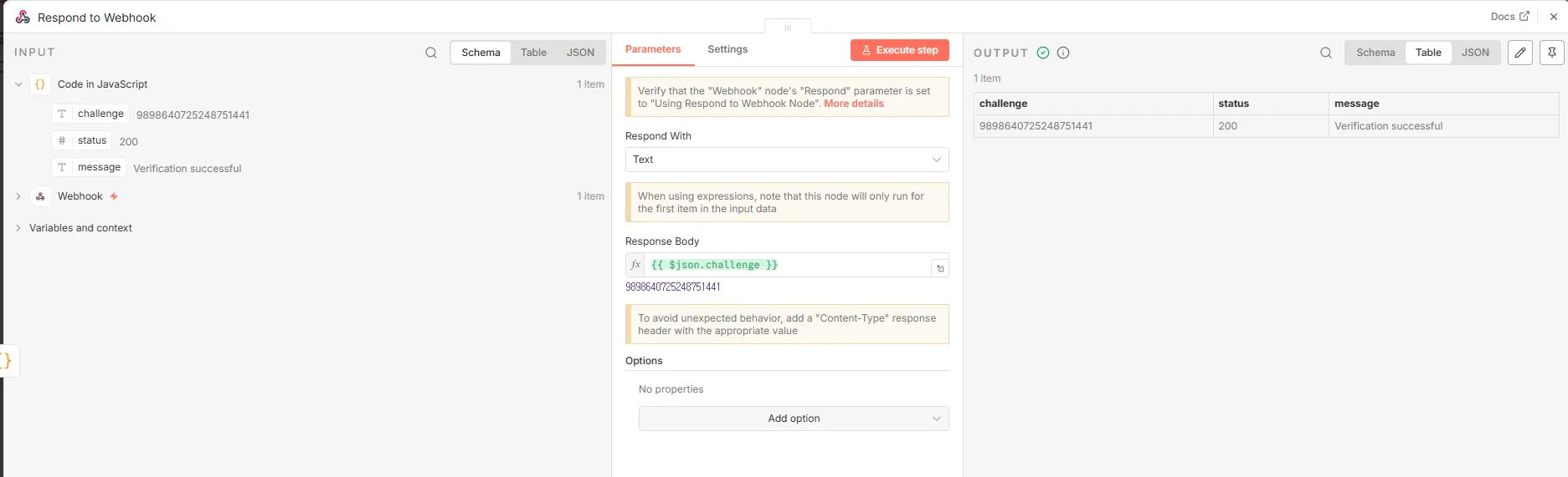그 다음 Response webhook에서 타입을 Text로 바꿔준 뒤 왼쪽에서 challenge를 Response Body에 드래그드롭한다.